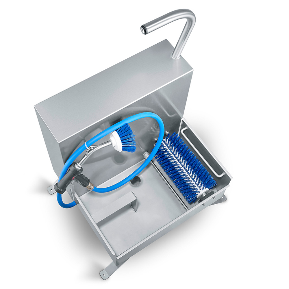 Le lave-bottes 100-013 est un lave bottes compact et professionnel pour le nettoyage des semelles de bottes ainsi que de leurs tiges et de leur partie supérieure. Il est idéal pour les petites entreprises de production dans l'industrie alimentaire et pour les abattoirs. La combinaison du nettoyage mécanique des semelles et du nettoyage manuel tiges de bottes garantit un nettoyage efficace des bottes dans le respect des règles d'hygiène les plus strictes. L'utilisation d'acier inoxydable de haute qualité (1.4301) garantit la robustesse et la durabilité du lave botte.