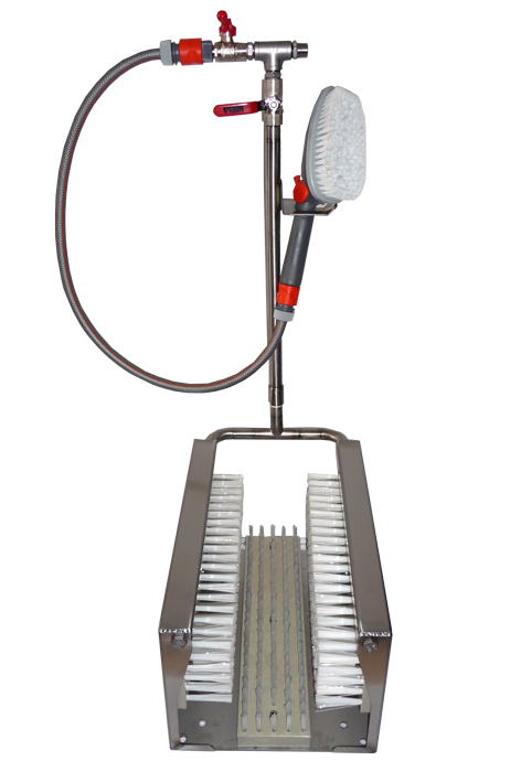 Au-dessus des brosses latérales se trouvent des barres de pulvérisation qui guident l'eau sur les bottes. La combinaison de l'eau courante et du frottement contre la brosse permet un nettoyage facile, efficace et flexible des bottes très sales. De plus, ce laveur de bottes est fourni avec une brosse à main conduisant de l'eau, qui peut être utilisée pour nettoyer les tiges de bottes et autres équipements.