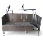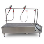 Afin de nettoyer les bottes très sales après usage, les employés nettoient d'abord les tiges de bottes et le dessus des bottes à l'aide d'une brosse à main aquifère de haute qualité. Les poils durs des brosses à main permettent d'enlever facilement les saletés les plus grossières. La botte à nettoyer repose sur un caillebotis articulé en acier inoxydable. Le laveur de bottes offre suffisamment d'espace pour que deux personnes puissent nettoyer leurs bottes en même temps.