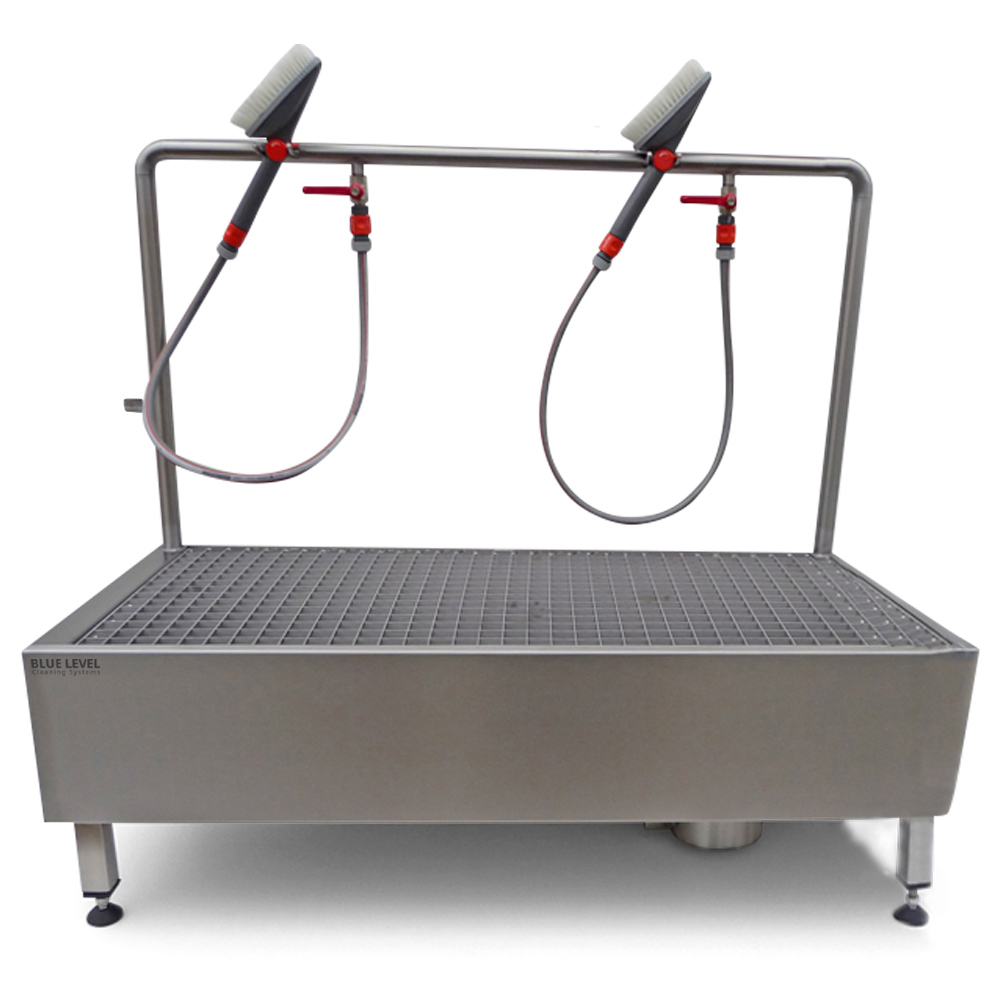 Le Lave-bottes avec brosses manuelles est un système professionnel de lavage de chaussures et de bottes pour une utilisation intensive comme c’est par exemple le cas dans l'agriculture, les boucheries ou les casernes de pompiers et les commissariats de police. Le bac de lavage en tôle d'acier inoxydable de 2 mm d'épaisseur et la grille galvanisée sont extrêmement robustes et conçus pour une utilisation quotidienne. Une version avec grille en acier inoxydable est disponible pour une utilisation dans les zones hygiéniques (voir options). Selon la version, la livraison comprend 2 à 6 brosses de lavage à main conduisant de l'eau.