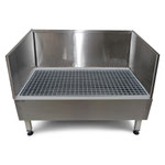 Pour le nettoyage des chaussures sales, les bottes et les chaussures peuvent être positionnées sur la grille de l'auge de lavage. Les chaussures sont nettoyées rapidement et à fond avec des brosses à main et de l'eau fournie de l'extérieur. Les eaux usagées contaminées sont collectées par le grand canal et évacuées automatiquement dans le drain, ce qui empêche la répartition de l'humidité et de la saleté sur une grande surface. L'évacuation du bac de lavage des bottes peut être équipée, optionellement, d'un piège à boues et d'un piège à odeurs (voir options). Le lave-bottes peut être équipé de parois de protection supplémentaires contre les éclaboussures d'eau (voir options).