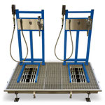 Un étrier de maintien en acier inoxydable placé à la bonne hauteur offre stabilité et sécurité lors du processus de nettoyage. Sur le côté gauche de chaque bac et de chaque support se trouve une brosse de lavage à main alimentée en eau avec une vanne à fermeture rapide et un tube de rinçage en acier inoxydable, afin de rendre le nettoyage des chaussures encore plus précis. L'étrier de maintien dispose d'une valve d'arrêt d'eau automatique intégrée, qui peut être facilement actionnée d'une seule main. Il existe deux variantes et tailles de lave-chaussures au choix: l'une avec une seule place de lavage et l'autre avec une double capacité, qui offre deux surfaces de nettoyage des bottes. L'installation double qui peut être commandée est également dotée d'un séparateur de système BA certifié selon la norme DIN 1717, afin de préserver la qualité de l'eau.