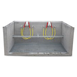 Les conduites d'eau isolées et les raccordements sont à la charge du client. Les éléments sanitaires doivent être installés sur place par un spécialiste. Pour une protection maximale contre le gel, la paroi arrière offre toutefois un espace supplémentaire pour l'installation hivernale par le sanitaire, comme la tuyauterie, les raccords et les conduites d'eau. Pour les versions à 2 et 4 places, il est possible d'installer l'évacuation d'eau sur le côté gauche ou droit. Dans la version standard, celle-ci est placée au centre. Les versions à 6 et 8 postes de nettoyage possèdent deux évacuations coulées de chaque côté. Les évacuations sont généralement équipées d'un manchon de regard (NW 100).